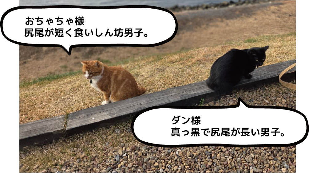ダンくんとおちゃちゃは首輪をしていますが、首輪をしていない猫ちゃんは野生の猫ちゃんです( =•ω• =)