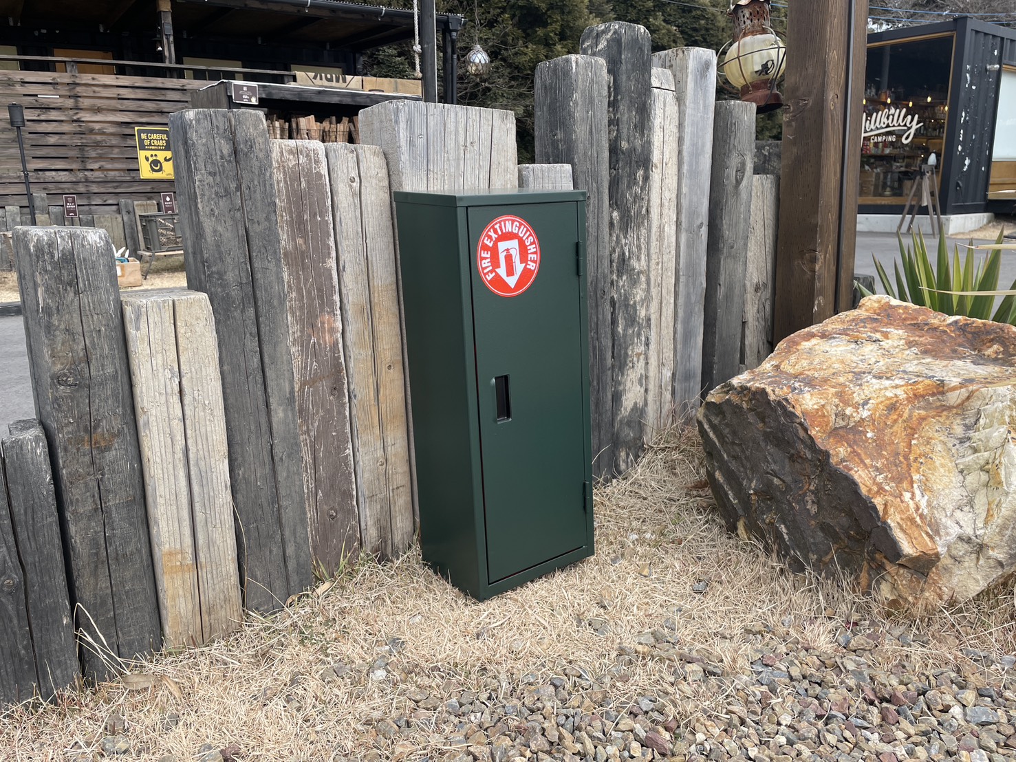 雨が少なく、火災リスクが高くなっておりますので、全てのテントサイトに消化器を設置いたしました。また、コンテナハウスにおきましても全てのお部屋に消化器を設置しており、管理棟においては新たに大型の消化器を設置しました。