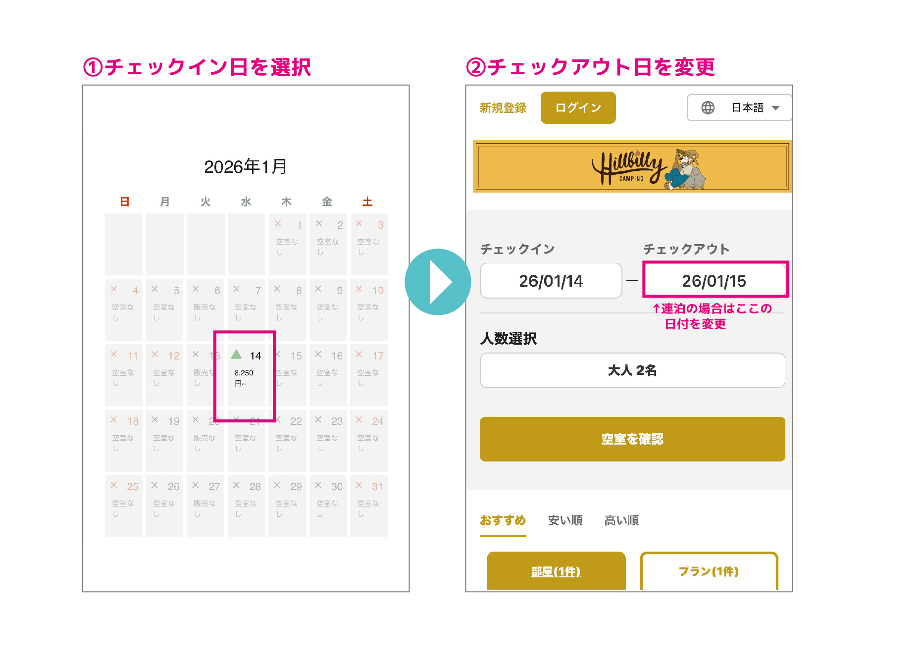 チェックアウト日を設定した後に、サイトの指定が可能です。 ご不明などございましたら、LINEにてお問い合わせをお願いします。